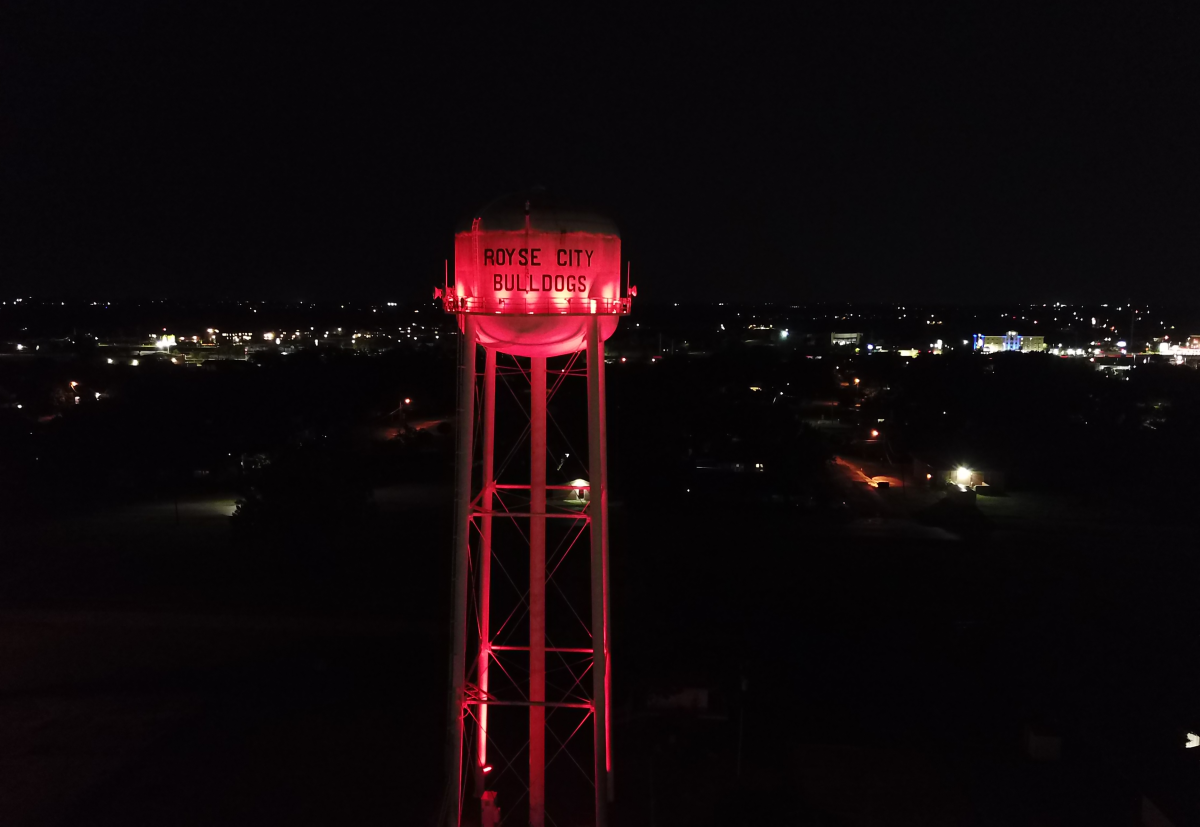 We installed programmable, color-changing lights on the water tower in Royse City, TX. City officials have scheduled the lights to change according to a calendar, bringing spirit and awareness to a variety of special events and holidays.